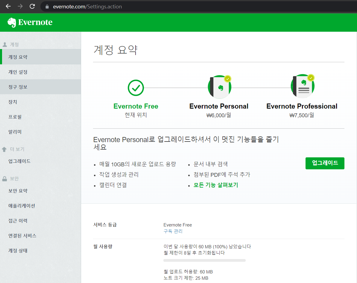 에버노트 무료버전은 접속기기를 2대로 제한한다.