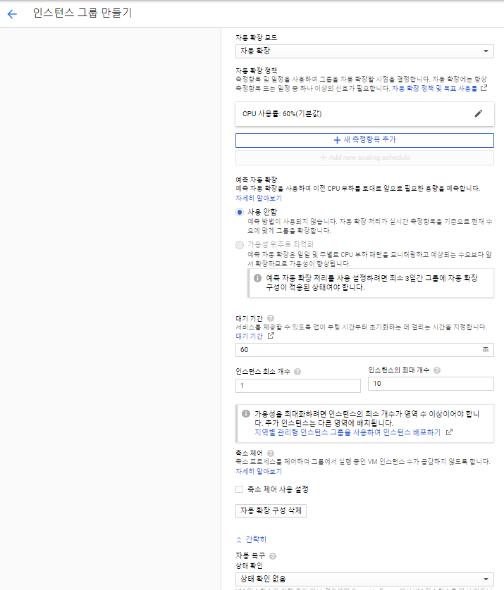 위 설정 중 자동확장 기능을 켜면 Autoscaling기능이 활성화되며, 이때 자동 확장 정책을 CPU 사용량/부하분산 사용률/stackdriver모니터링 측정항목 중 선택하고 기준을 정하여 autoscaling이 되도록 설정할 수 있다.