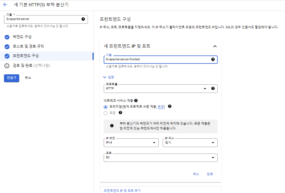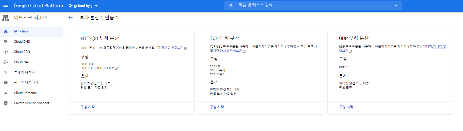 * 지원 종류 : HTTP(s) load balancing, SSL Proxy, Network TCP/UDP load balancing, TCP Proxy