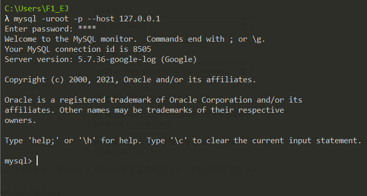 cloud_sql_proxy -instances=[아까 복사한 연결 이름]=tcp:3306 -credential_file= [아까 저장한 키 풀 경로]