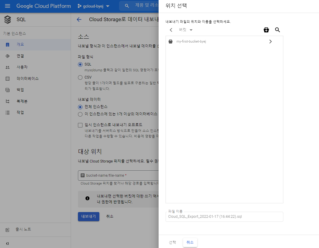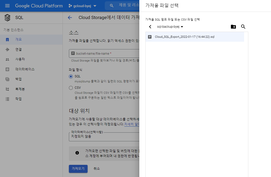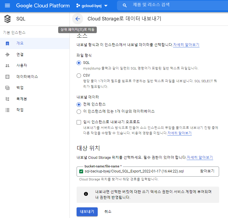 cloud SQL에서 내보내기, 가져오기 기능으로 백업 및 복구하는 방법을 알아보자.