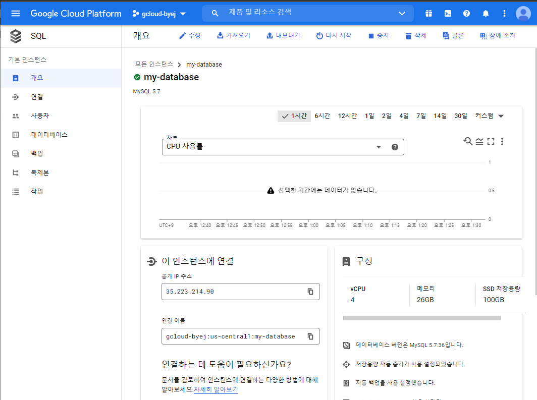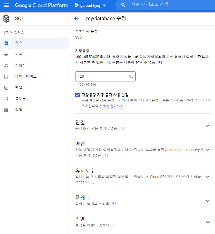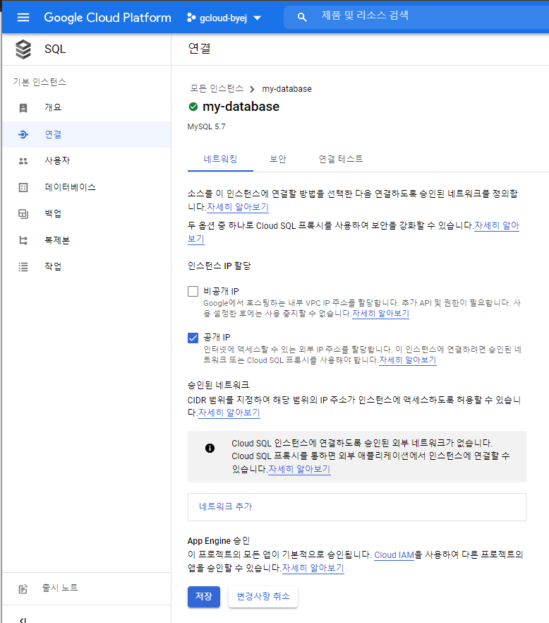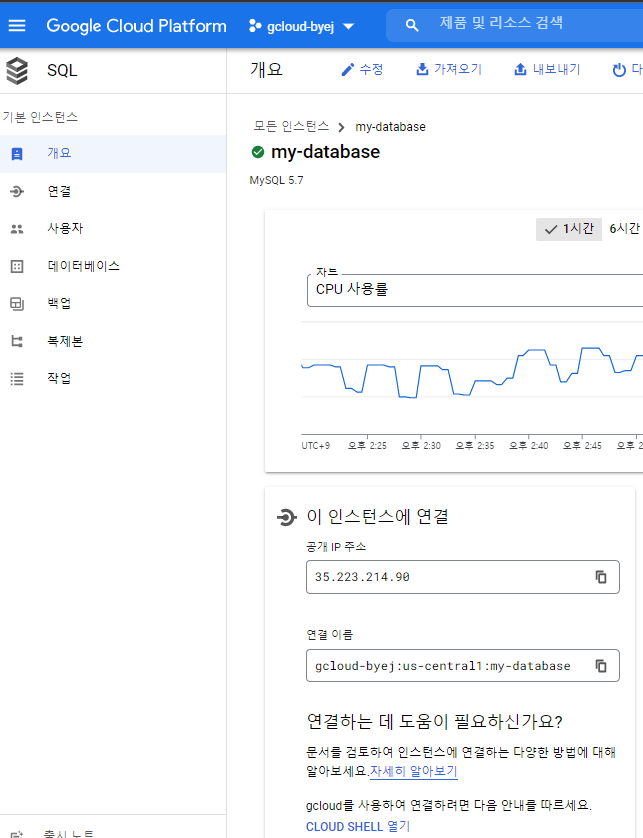 연결 이름 : gcloud-byej:us-central1:my-database