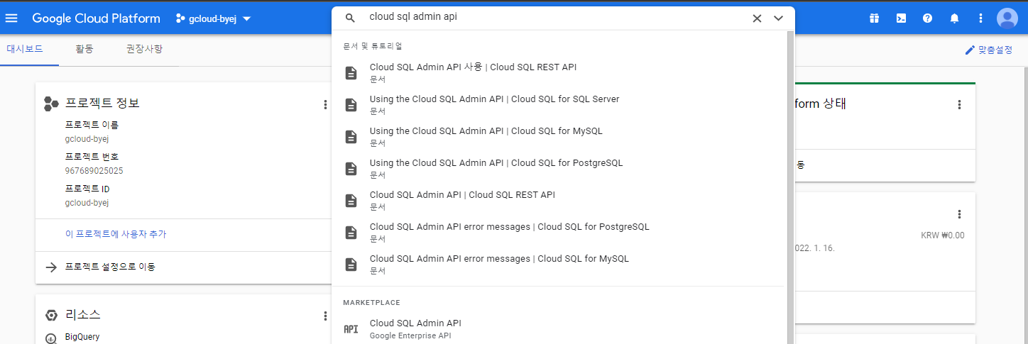 1. 먼저 Cloud SQL Admin API 사용 설정을 해보자