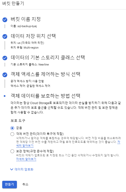 내보내기는 Google Cloud Storage에 저장되기 때문에 저장될 버킷을 선택해야 한다.