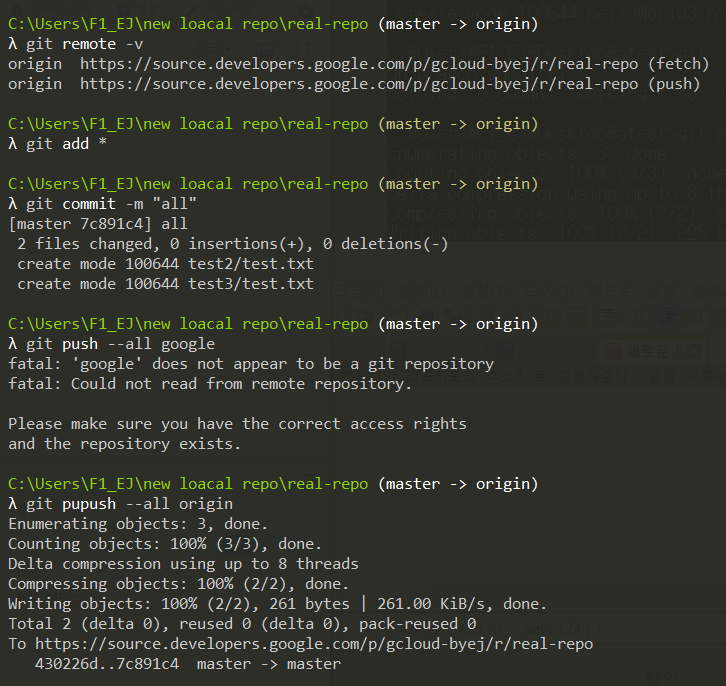 2. 구글 리모드 저장소(real-repo)를 먼저 로컬 저장소(new local repo)로 옮겨오겠다.