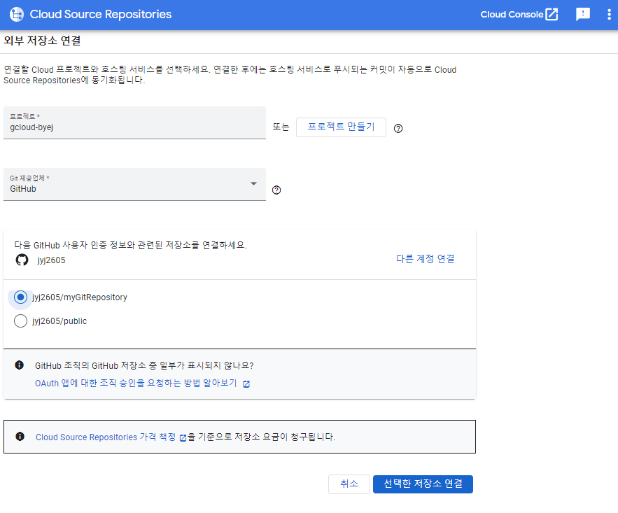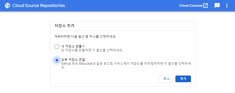 GItHub나 BitBucket Repository를 cloud source repository에 연결할 수 있으며, 연결된 repository는 자동으로 동기화된다.