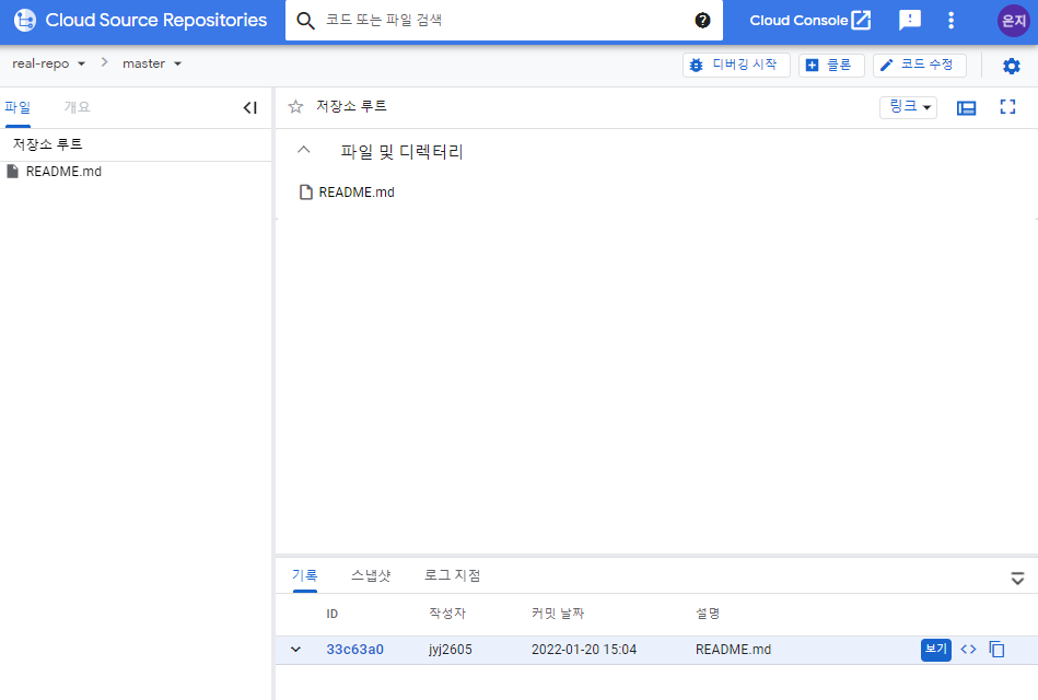 해당 폴더에 README.md라는 파일 하나를 올려보자. 해당 파일을 구글 클라우드 저장소에 올려볼 예정이다.