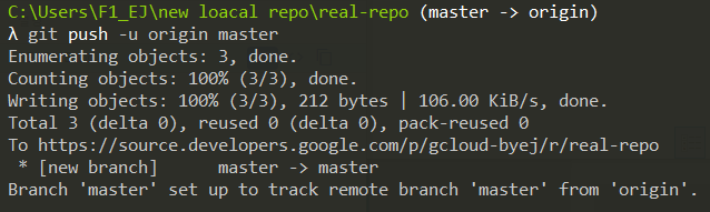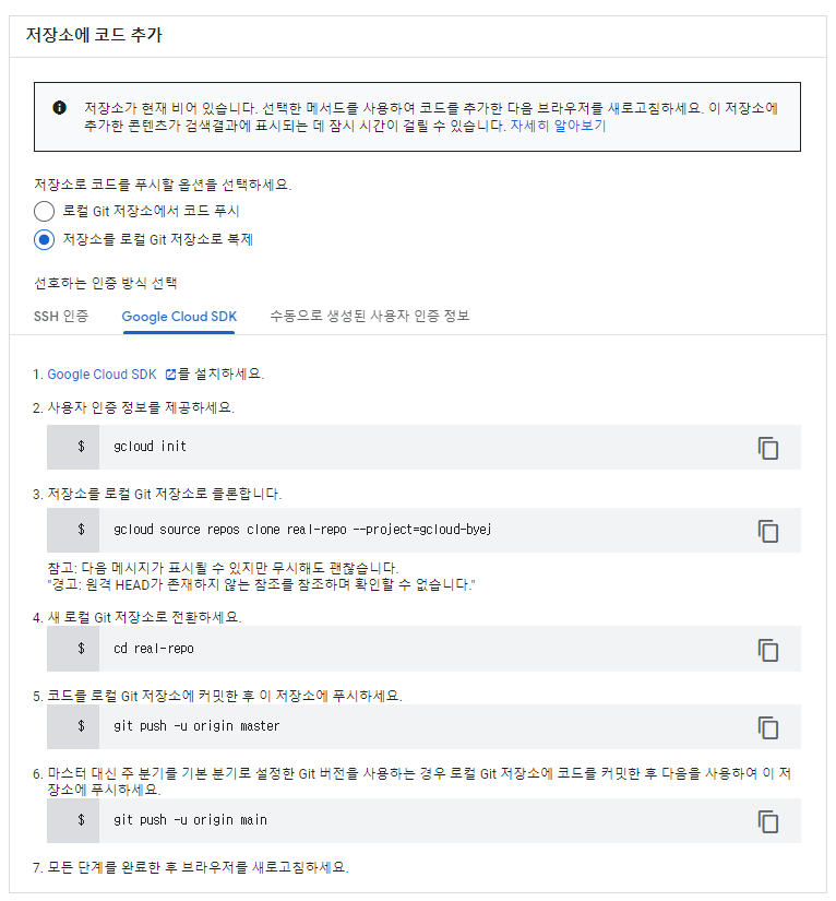 위 과정은 로컬로 구글에 있는 real-repo를 복사해 오는 과정이다. (빈 것이라 warninig이 뜨니 걱정 안 해도 된다.)
