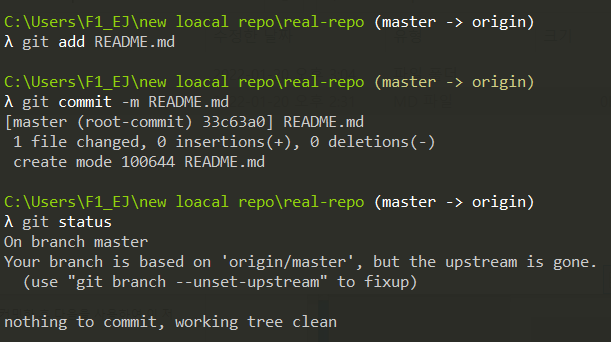 * 먼저 파일을 업로드하지 않는 이유는 먼저 real-repo 저장소 공간을 new local repo안에 만들어주기 위함이다. (다른 폴더들과 헷갈리지 않기 위해)