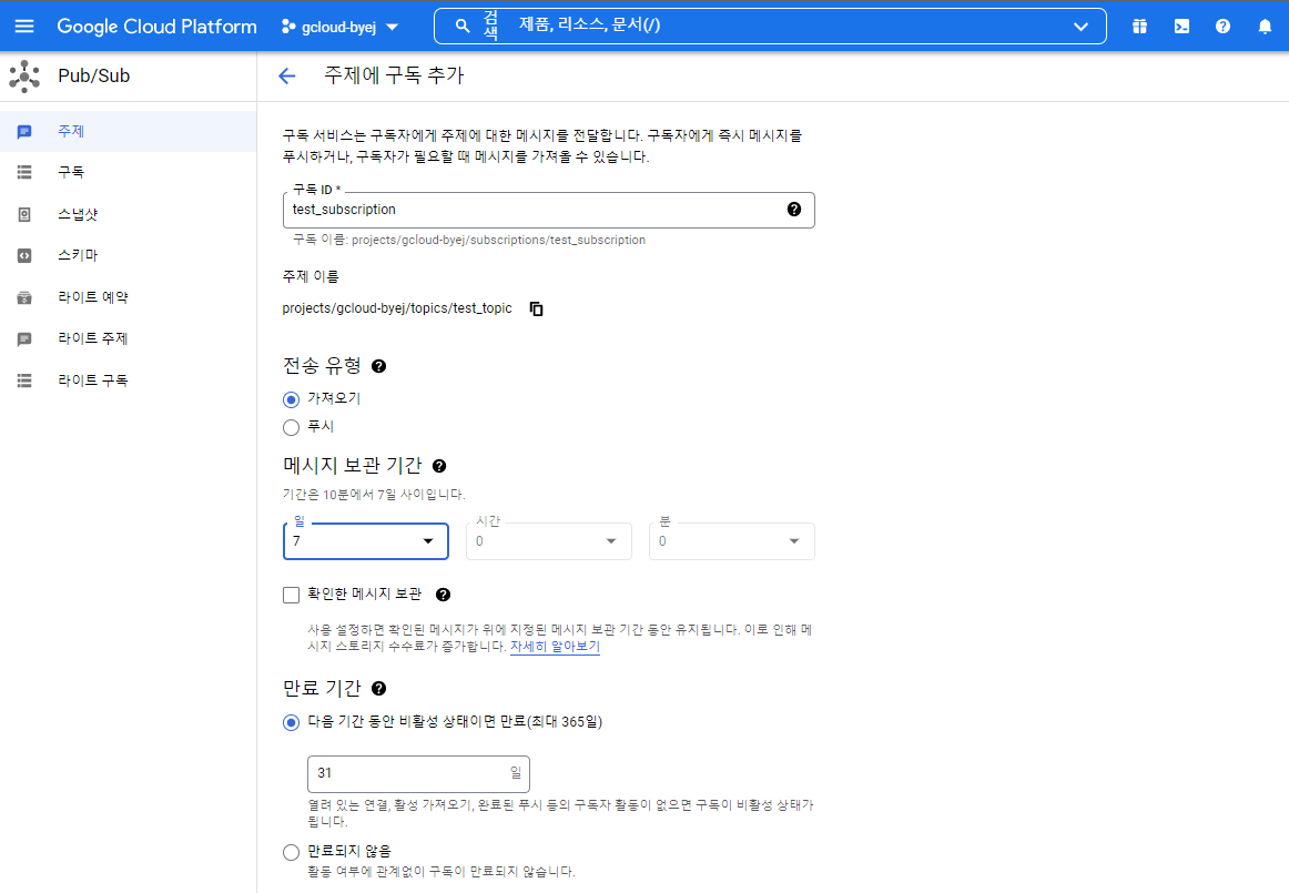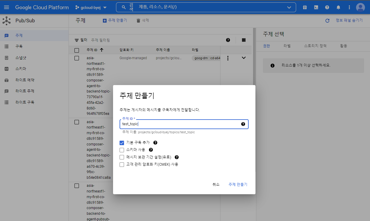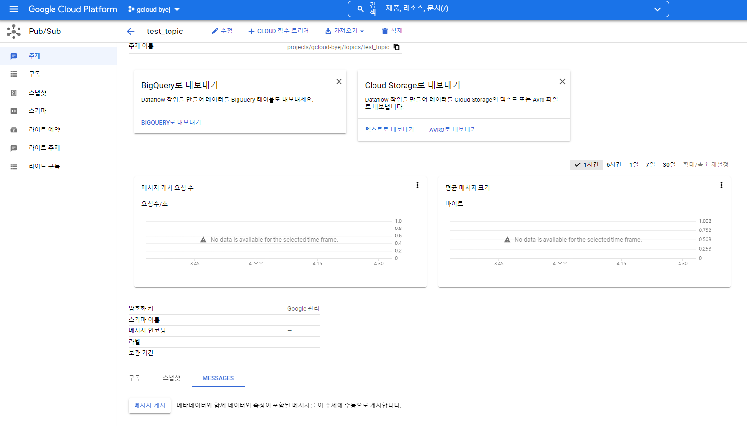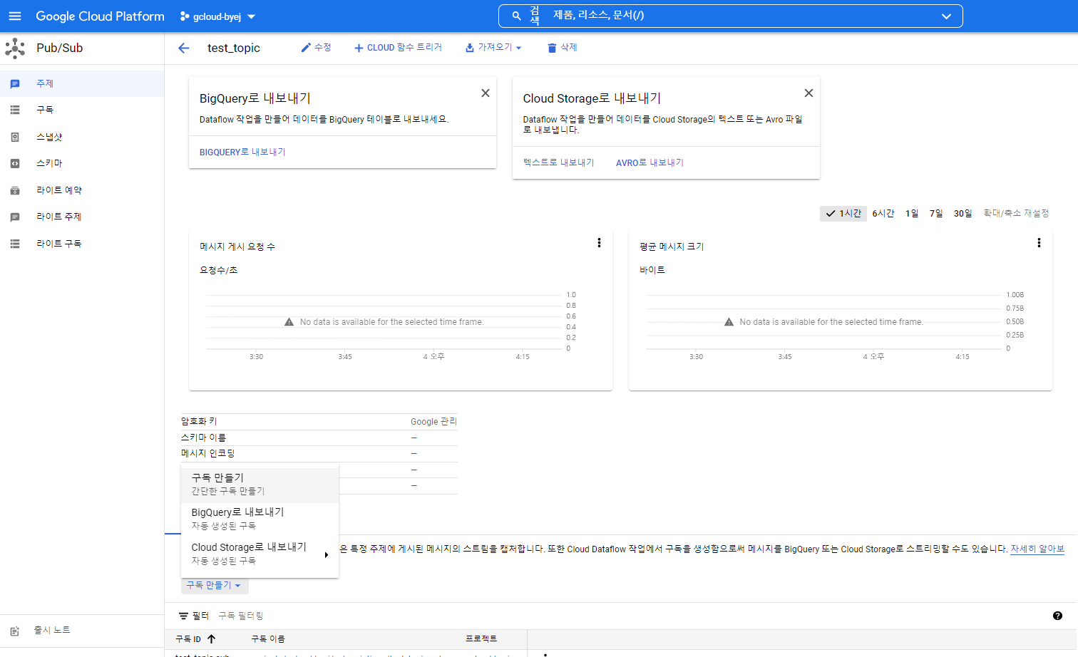 twitter api로 원하는 키워드 검색하고 pub/sub에 적용해 보자 1. google cloud pub/sub 주제 만들기 2. twitter streaming data를 google cloud pub/sub에 publish 하기 3. google cloud function을 이용하여 biq..