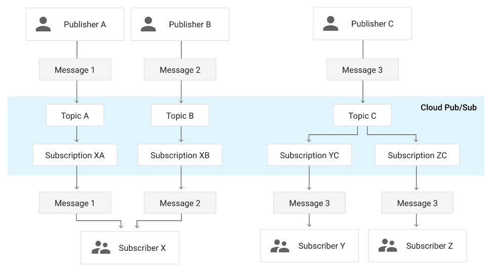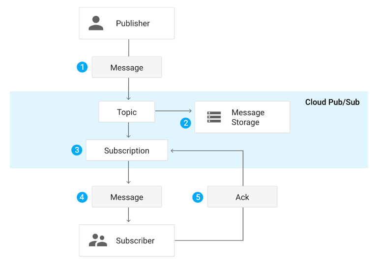 'Toppic(게시)'와 메시지를 해당 주체로부터 받는 'subscription(구독)'으로 구성되고 "1:다", "다:1", "다:다"의 구성을 가진다. 데이터는 구글 내부의 비공개 네트워크를 통해 데이터 센터에 지능저긍로 자동 분산된다.
