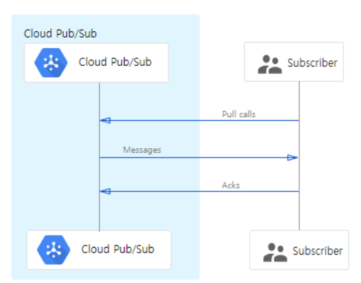 subscriber(구독자)가 message(데이터)를 요청할 때 전달받는 구조의 구독 방식이다.