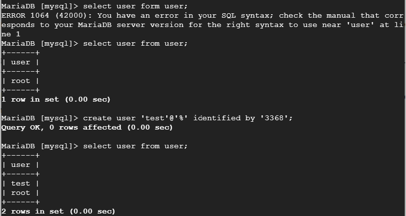 //test라는 유저를 %아무곳에서나 3368 비밀번호로 접속허용하게 만들겠다.