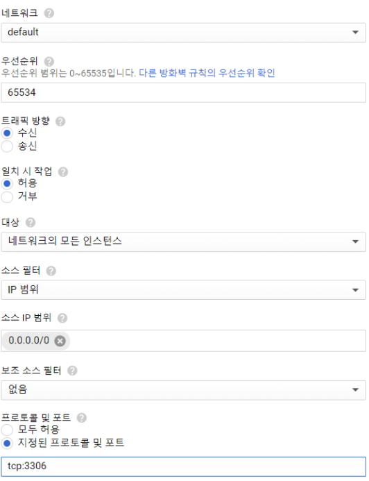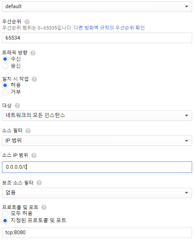GCP로 돌아와 VPC네트워크 → 방화벽 규칙 → 방화벽 규칙 만들기를 선택하여 방화벽 규칙을 만들자.