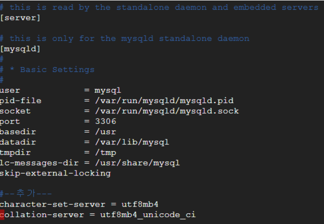 아래 두줄을 [mysqld]항목에 추가해주자.