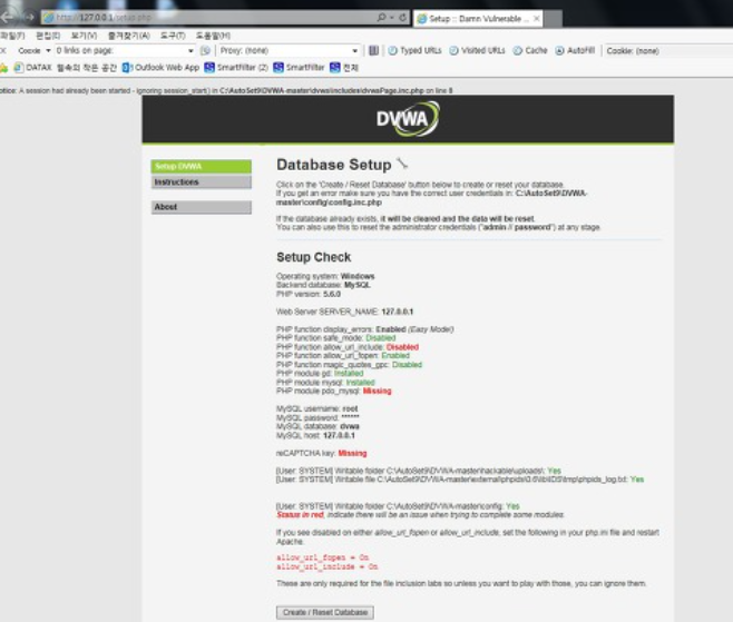 4) 홈페이지(127.0.0.1)에 접속하여 Create/Reset Database 버튼 클릭하여 데이터 페이스 생성